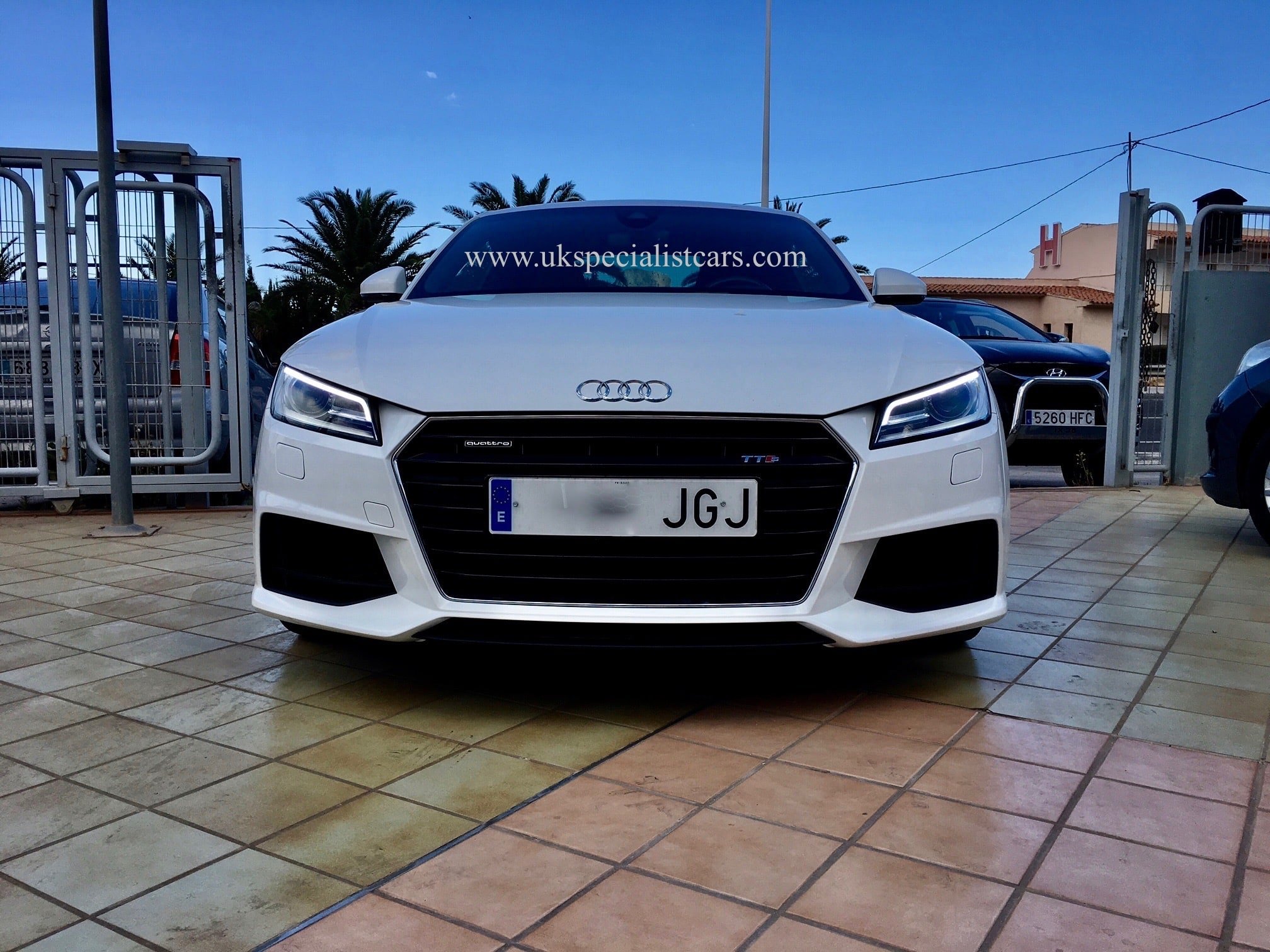 Audi TT S-Line 2.0 TFSI- S Tronic – AUTOMATIC – LHD In Spain. Ibis Pure white White, 19″ 5-twin-spoke titanium matt alloys, Air Conditioning, LED front and rear lights, electronic deployable spoiler, multifunction steering wheel, flappy gearshift paddles, cruise control, Audi Virtual Cockpit, satellite navigation, CD player, DAB Digital Radio, Audi’s Signature Hi-Fi sound system, front centre arm rest, Start – Stop System with Energy Recuperation, Rain Sensor, Black Cloth trim, Tyre Pressure Loss Indicator, Bluetooth Mobile Telephone Preparation, Keyless Go – Start/Stop Button, Anti – Theft Alarm. This car has only done 30,000 KMS / 18,000 Miles!